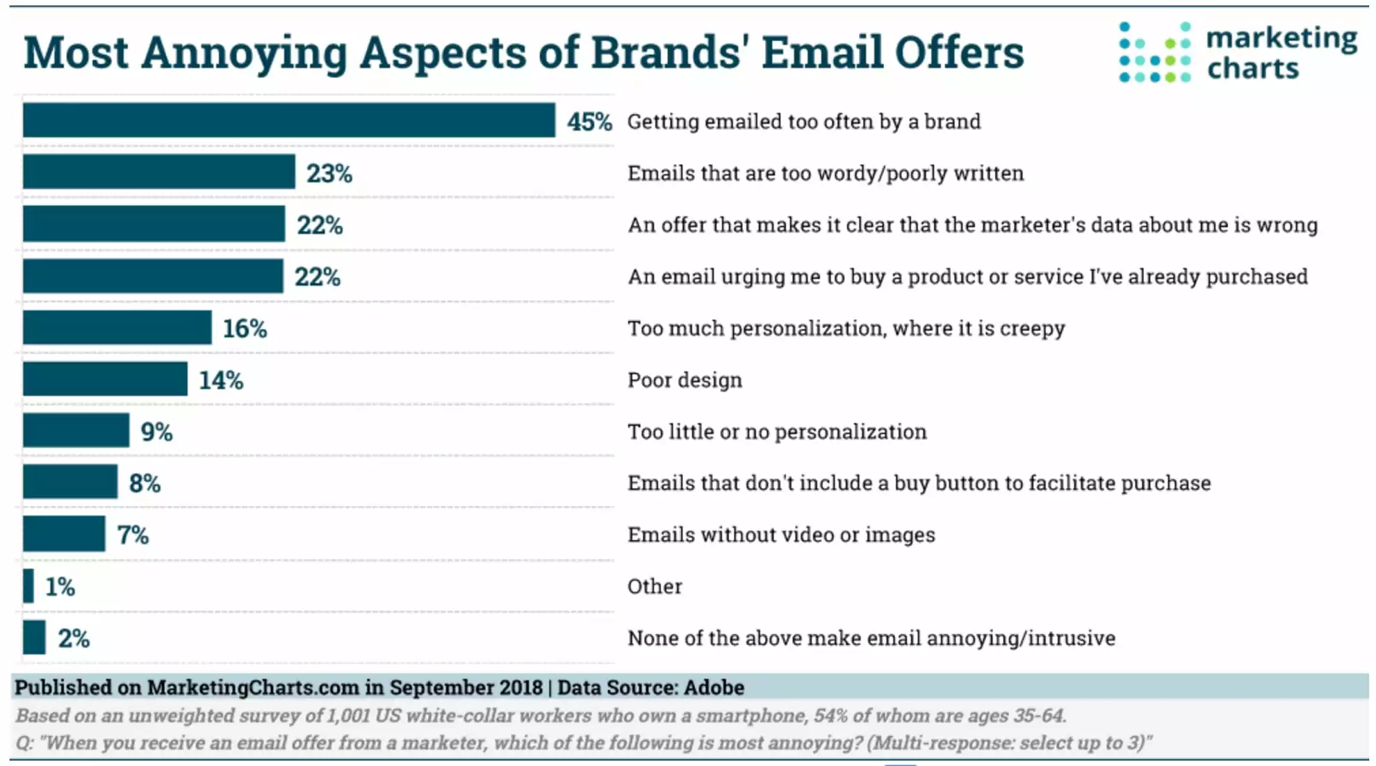 Dat zijn feitelijk de drie grootste irritaties die de klant heeft bij het lezen van de nieuwsbrief. 45% van de respondenten in het onderzoek geeft aan dat ze vinden dat ze te vaak gemaild worden door een bedrijf. Daarna worden slecht geschreven e-mails genoemd als grootste bron van irritatie (23%) gevolgd door een aanbieding in de nieuwsbrief die duidelijk maakt dat het bedrijf niet over de juiste data van de klant beschikt (22%). Een aanbod dat de klant al reeds gekocht heeft (ook 22%) hangt daar nauw mee samen.