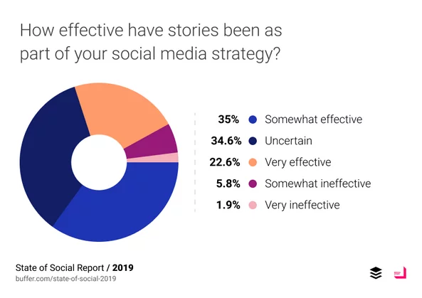 Hoewel 62.9% van Buffers respondenten aangaf story ads nog niet te gebruiken, is 61% van plan dat in 2019 wel te gaan doen. En terecht, want stories lijken behoorlijk effectief. Meer dan de helft van de marketeers die Buffer ondervroeg (57.6%) gaf aan dat stories redelijk tot zeer effectief zijn als deel van hun social media strategie. Een deel van de respondenten (35%) kon niet met zekerheid zeggen hoe effectief stories waren. Slechts een klein percentage (7.7%) had het gevoel dat strories niet of weinig effectief zijn.