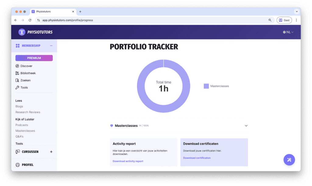 Naast het LMS werd ook de app verder uitgebreid met nieuwe functionaliteit. We ontwikkelden een Portfolio Tracker, waarmee gebruikers automatisch hun activiteiten bijhouden en accreditatiepunten kunnen aanvragen via gepersonaliseerde rapportages en certificaten.