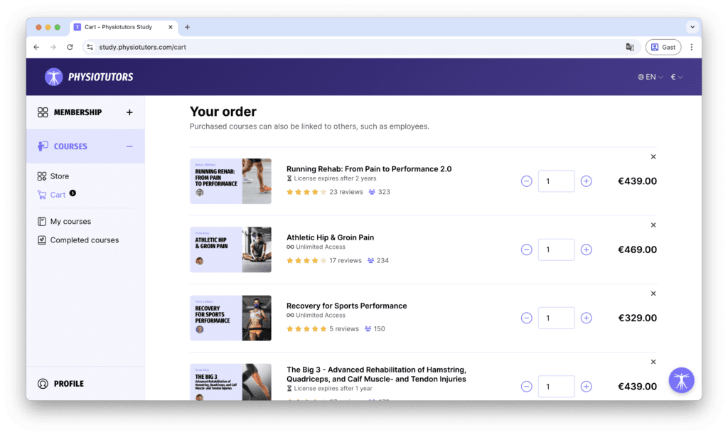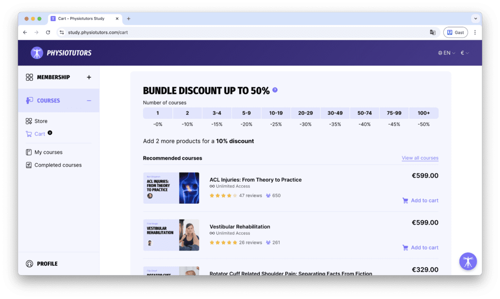 Voor het kopen van een cursus of het afsluiten van een abonnement, ondersteunt het platform directe betalingen via Stripe, inclusief factuurbetalingen, staffelkortingen, bundels en coupons. De checkout is volledig op maat ontwikkeld zodat Physiotutors flexibel kan experimenteren met prijsmodellen en promoties.