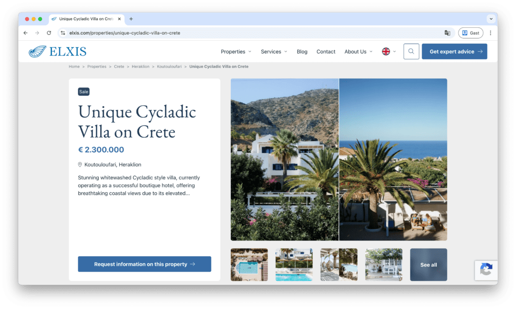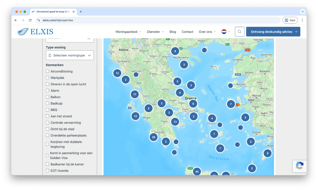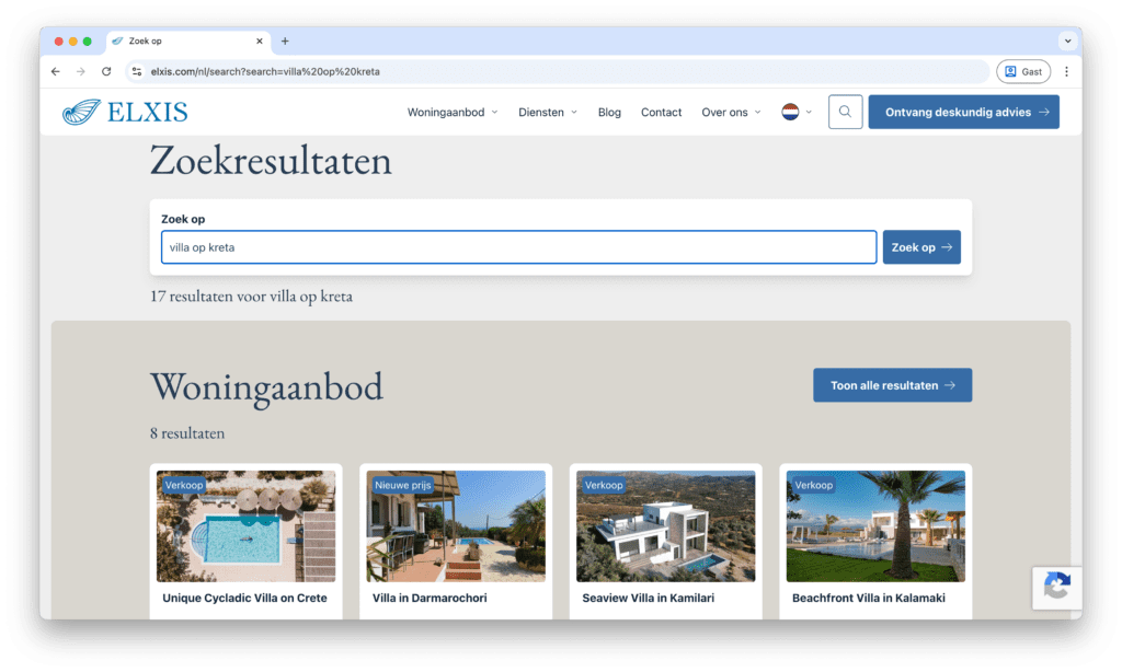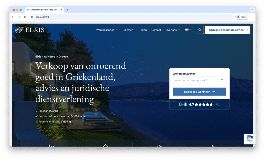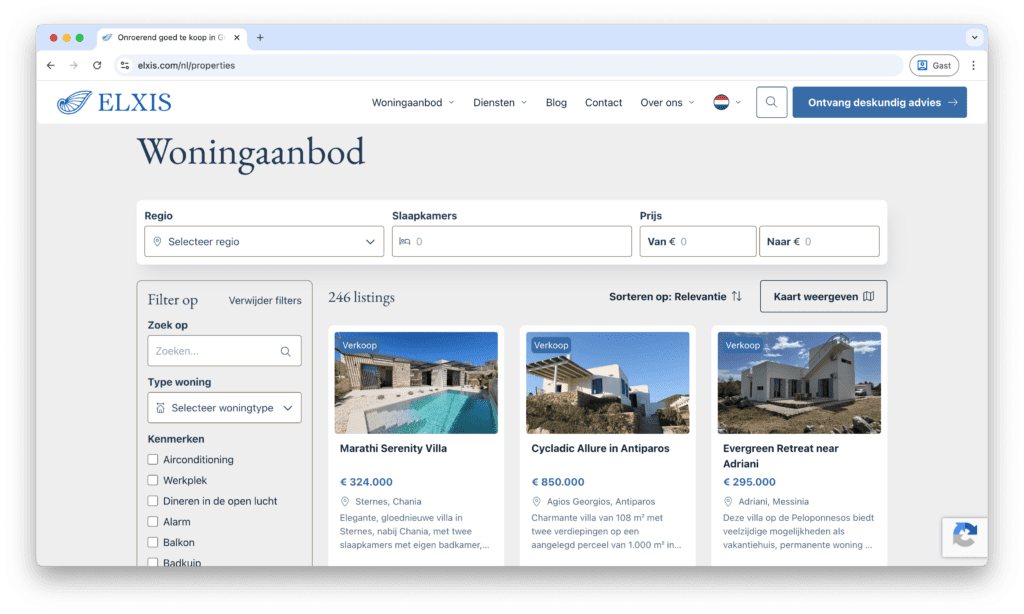 De bestaande website voldeed niet meer aan de ambities van Elxis. Er was behoefte aan een modern platform dat beter aansluit bij de internationale doelgroep en de groei van het bedrijf. Naast een vernieuwde uitstraling moest de website ook slimmer worden in zoeken, filteren en presenteren van woningen.