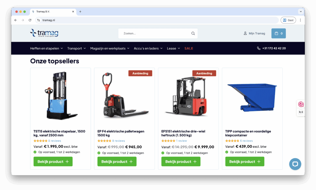 De backend is opgezet met gebruiksgemak in gedachten: het team van Tramag kan moeiteloos nieuwe producten toevoegen, aanpassen en promoties beheren. Door het gebruik van maatwerkblokken is het beheer van contentpagina’s flexibel en intuïtief. De webshop draait op een snelle, stabiele basis, klaar voor verdere groei in aanbod én functionaliteit.