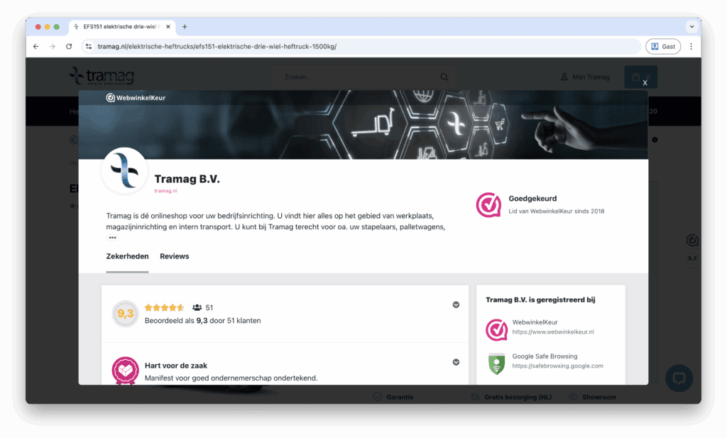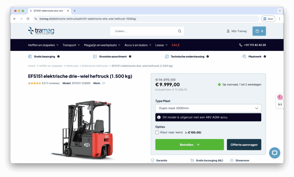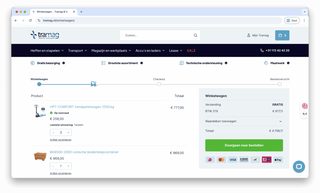 Voor Tramag ontwikkelden we een WooCommerce-webshop die volledig is afgestemd op het uitgebreide assortiment en de zakelijke doelgroep. De structuur van de webshop maakt het eenvoudig om snel de juiste producten te vinden dankzij duidelijke categorieën, slimme filters en een helder productoverzicht. Elk product is voorzien van uitgebreide informatie, technische specificaties en duidelijke fotografie, zodat klanten goed geïnformeerd hun keuze kunnen maken.