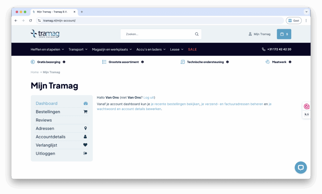 Ook het accountgedeelte werd gebruiksvriendelijk ingericht. In hun persoonlijke omgeving kunnen klanten eenvoudig hun orderhistorie bekijken, facturen downloaden en hun profielgegevens beheren. Dit geeft zakelijke gebruikers snel inzicht in eerdere bestellingen en maakt herhaalorders eenvoudig. Zo draagt het accountdashboard bij aan een soepel bestelproces.